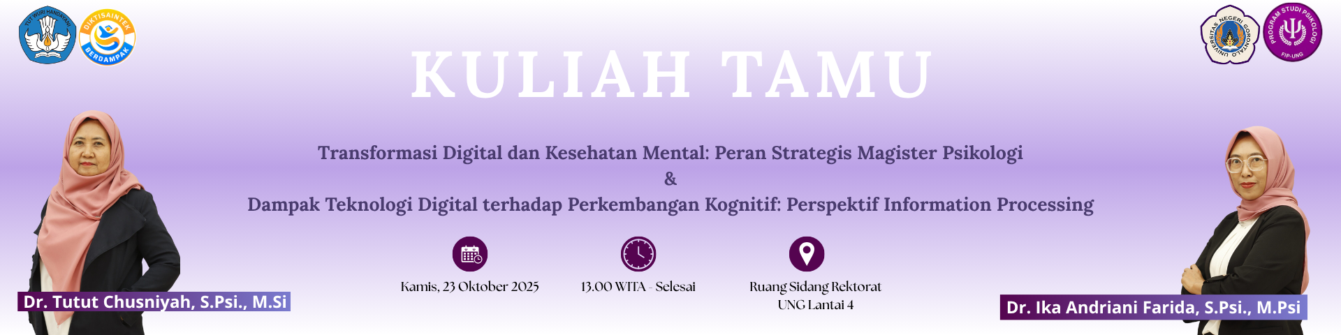 Fakultas Ilmu Pendidikan Universitas Negeri Gorontalo menyelenggarakan kegiatan Kuliah Tamu dan Sosialisasi Program S2 dan S3 Psikologi Universitas Negeri Malang (UM). Kegiatan ini merupakan bagian dari upaya fakultas dalam memperkuat kolaborasi akademik dan membuka wawasan sivitas akademika terhadap peluang pengembangan studi lanjut di bidang psikologi. Kegiatan ini menghadirkan dua narasumber dari Universitas Negeri Malang, yaitu: 1. Dr. Tutut Chusniyah, S.Psi., M.Si. dengan materi, Transformasi Digital dan Kesehatan Mental: Peran Strategis Magister Psikologi. 2. Dr. Ika Andriani Farida, S.Psi., M.Psi. dengan materi, Dampak Teknologi Digital terhadap Perkembangan Kognitif: Perspektif Information Processing. Kuliah tamu ini akan dipandu oleh Sri Wahyuningsih M. Polinggapo, S.Psi., M.Psi., Psikolog sebagai moderator.