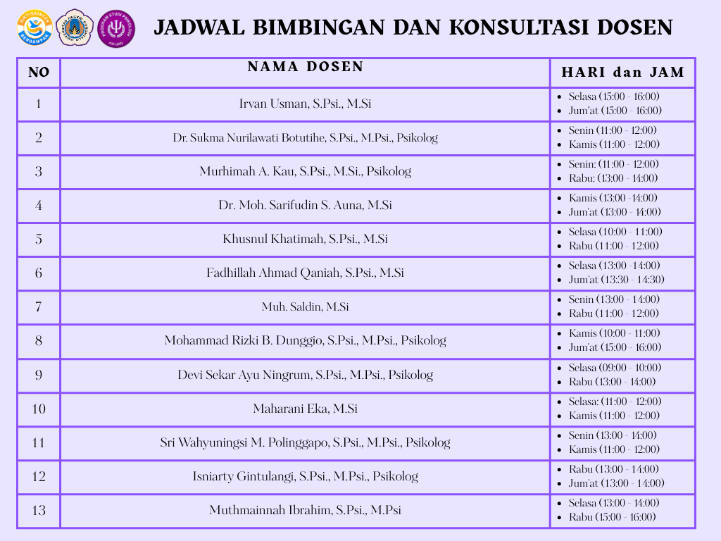 Mahasiswa dapat mengakses bimbingan dan konsultasi dosen untuk mendukung akademik, tugas akhir, penelitian, dan pengembangan diri. Silakan hubungi dosen melalui email atau media komunikasi resmi dan sesuaikan dengan jadwal konsultasi yang telah ditentukan.